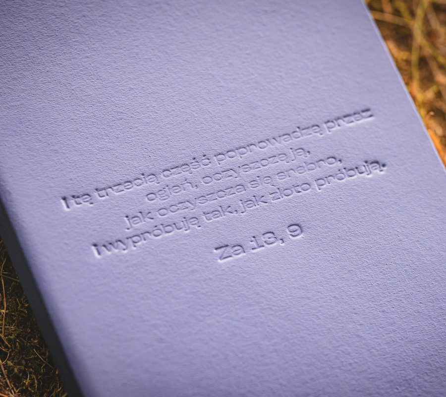 W środku znajduje się papier recyklingowy w linie. Notatnik ma również materiałową zakładkę, miejsce na długopis oraz gumkę, którą można zamknąć notatnik. Z przodu znajduje się wytłoczony cytat z Księgi Zachariasza 13,9: I tę trzecią część poprowadzę przez ogień, oczyszczę ją, jak oczyszcza się srebro, i wypróbuję tak, jak złoto próbują.”. Z tyłu notatnika znajduje się wytłoczone logo Alpha.